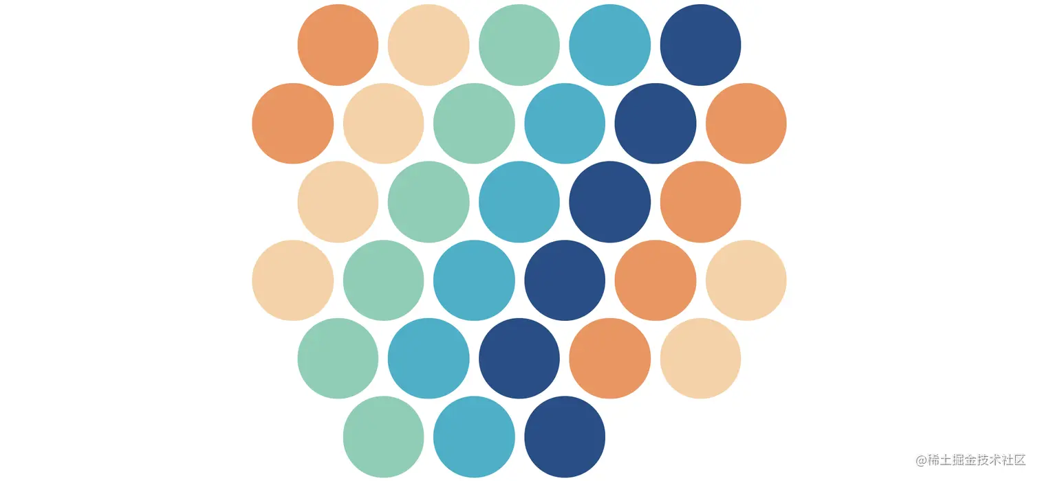 让我们从气泡的基本蜂窝网格开始。我们稍后将处理布局中气泡的大小调整以及其他相关效果。如下图所示是每隔一个完整的气泡行出现一个少一个气泡的行,以及最后一行的气泡是不完整的居中气泡行。
