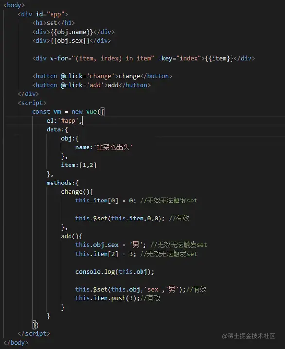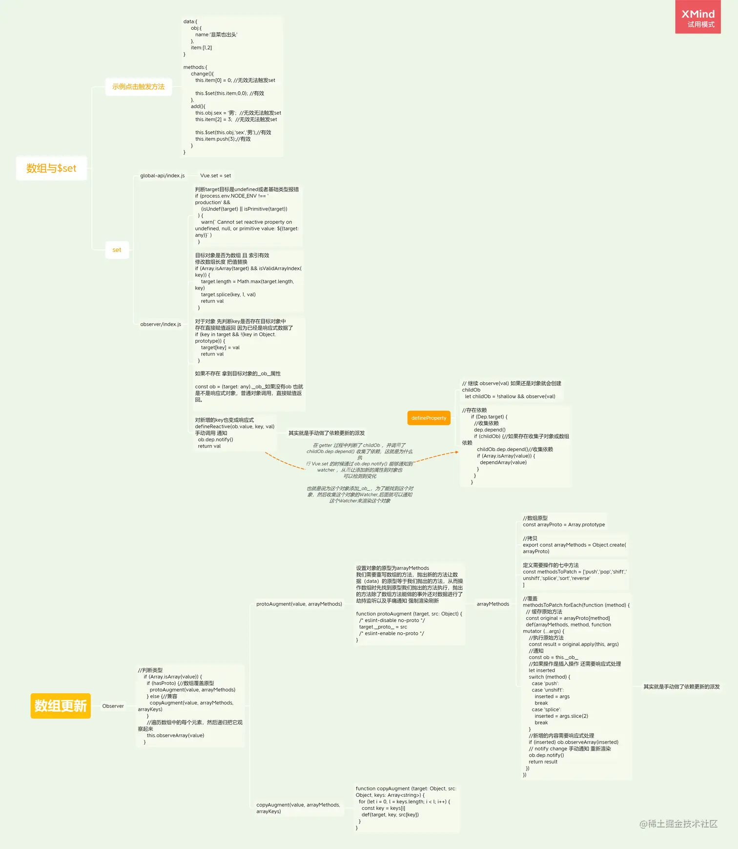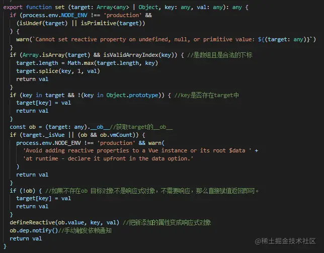 set ⽅法接收 3个参数, target 可能是数组或者是对象, key 代表的是数组的下标或者是对象的键值, val 代表添加的值。⾸先判断如果 target 是数组且 key 是⼀个合法的下标,则调用数组的splice,这⾥的 splice 其实已经不仅仅是原⽣数组的 splice 了,后面说到数组就清楚了。接着⼜判断 key 是否存在target 中,是直接赋值返回,存在说明已经是响应式数据了。接着再获取到 target.ob 并赋值给 ob ,之前分析过它是在 Observer 的构造函数执⾏的时候初始化的,表⽰ Observer 的⼀个实例,如果它不存在,则说明 target 不是⼀个响应式的对象,则直接赋值并返回。最后通过 defineReactive(ob.value, key, val) 把新添加的属性变成响应式对象,然后再通过 ob.dep.notify() ⼿动的触发依赖通知,回忆以下之前在给对象添加get的时候有这么⼀段逻辑: