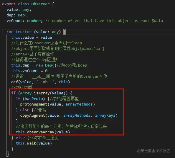 我们刚才也分析到,对于 Vue.set 的实现,当 target 是数组的时候,也是通过 target.splice(key, 1, val) 来添加的,那么这⾥的 splice做了啥,能让添加的对象变成响应式的呢。之前我们也说过,在通过 observe ⽅法去观察对象的时候会实例化 Observer ,在它的构造函数中是有专门对数组做了处理。