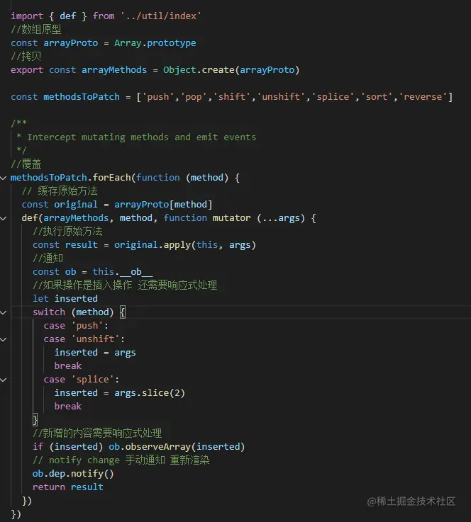 5.arrayMethods首先获取数组原型然后拷贝一份,接着定义了数组操作的七个方法。遍历七个方法首先获取原始数组的方法,紧着着调用def对拷贝的数组的每个方法做以下处理,首先执行原始的方法操作,其次获取到当前对象的ob,如果方法的操作是插入操作 还需对其做响应式处理,最后通过ob.dep.notify()手动触发依赖通知。