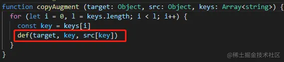 copyAugment⽅法是遍历 keys,通过 def ,也就是 Object.defineProperty 去定义它⾃⾝的属性值。