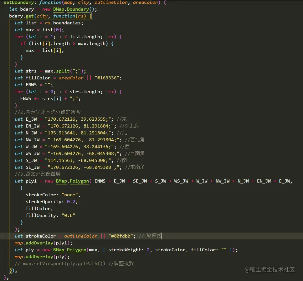 let myMap = { init: function(id, point, zoom, enableScrollWheelZoom, mapType) { let map = new BMap.Map(id, { enableMapClick: false }); map.centerAndZoom(new BMap.Point(point.longitude, point.latitude), zoom); map.enableScrollWheelZoom(enableScrollWheelZoom || true); map.setMapType(mapType || BMAP_HYBRID_MAP); return map; }, setBoundary: function(map, city, outlineColor, areaColor) { let bdary = new BMap.Boundary(); bdary.get(city, function(rs) { let list = rs.boundaries; let max = list[0]; for (let i = 1; i < list.length; i++) { if (list[i].length > max.length) { max = list[i]; } } let strs = max.split(";"); let fillColor = areaColor || "#163336"; let ENWS = ""; for (let i = 0; i < strs.length; i++) { ENWS += strs[i] + ";"; } //2.自定义外围边框点的集合 let E_JW = "170.672126, 39.623555;"; //东 let EN_JW = "170.672126, 81.291804;"; //东北角 let N_JW = "105.913641, 81.291804;"; //北 let NW_JW = "-169.604276, 81.291804;"; //西北角 let W_JW = "-169.604276, 38.244136;"; //西 let WS_JW = "-169.604276, -68.045308;"; //西南角 let S_JW = "114.15563, -68.045308;"; //南 let SE_JW = "170.672126, -68.045308 ;"; //东南角 //3.添加环形遮罩层 let ply1 = new BMap.Polygon( ENWS + E_JW + SE_JW + S_JW + WS_JW + W_JW + NW_JW + N_JW + EN_JW + E_JW, { strokeColor: "none", strokeOpacity: 0.2, fillColor, fillOpacity: "0.6" } ); let strokeColor = outlineColor || "#00fdbb"; // 轮廓线 map.addOverlay(ply1); let ply = new BMap.Polygon(max, { strokeWeight: 2, strokeColor, fillColor: "" }); map.addOverlay(ply); // map.setViewport(ply.getPath()) //调整视野 }); }, //地图添加标注 addMarkersToMap: function(map, mapData) { let MarkerList = []; for (let i = 0; i < mapData.length; i++) { let Point = new BMap.Point(mapData[i].longitude, mapData[i].latitude); let icon = new BMap.Icon( mapData[i].iconData.icon, new BMap.Size(mapData[i].iconData.size[0], mapData[i].iconData.size[1]) ); // 创建标注 let Marker = new BMap.Marker(Point, { icon }); // 将标注添加到地图中 map.addOverlay(Marker); MarkerList.push(Marker); } return MarkerList; }, // 地图缩放 setZoom(map, zoom, longitude, latitude) { map.centerAndZoom(new BMap.Point(longitude, latitude), zoom); return zoom; }};export { myMap };