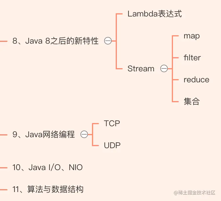- Java 8 之后的新特性:Lambda表达式、Stream(map、filter、reduce、集合)