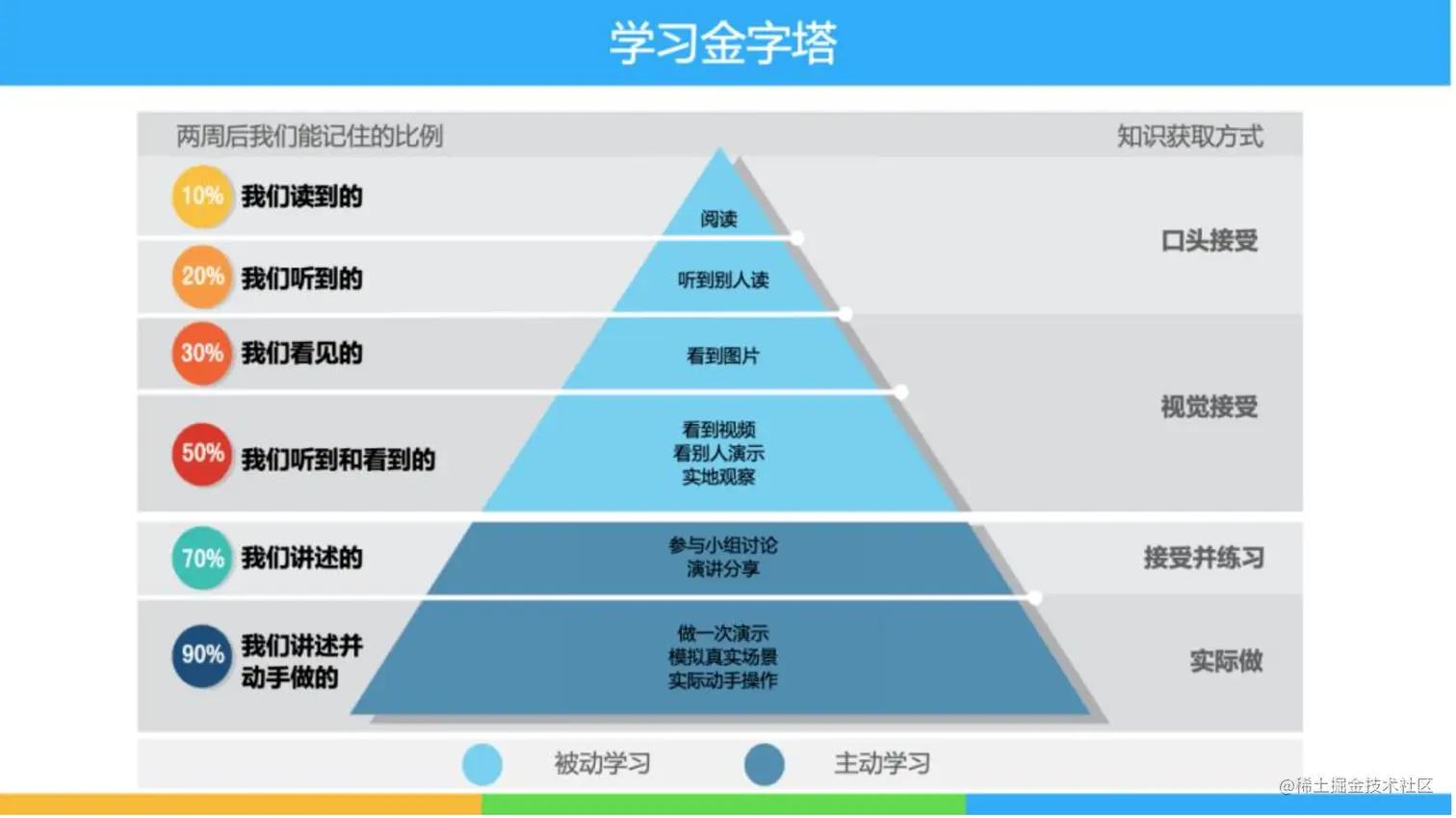 - 被动学习:如听讲、阅读、视听、演示,学习内容的平均留存率为 5%、10%、20% 和 30%。