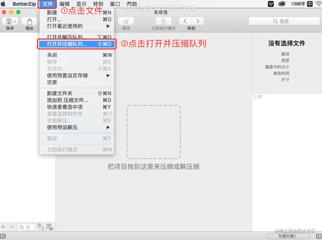回到BetterZip主界面,点击左上角的“文件”,弹出下拉框,在下拉框中选择“打开并压缩队列”,点击进 入。