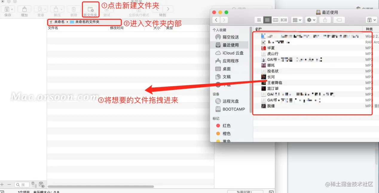 当然,我们也可以选择拖拽文件的形式将文件拖入BetterZip窗口来进行文件压缩。用这个方法就需要先在BetterZip中新建一个文件夹,然后往这个文件夹里面拖拽文件。在文件选择完毕后,即可右键文件夹,进行文件压缩。