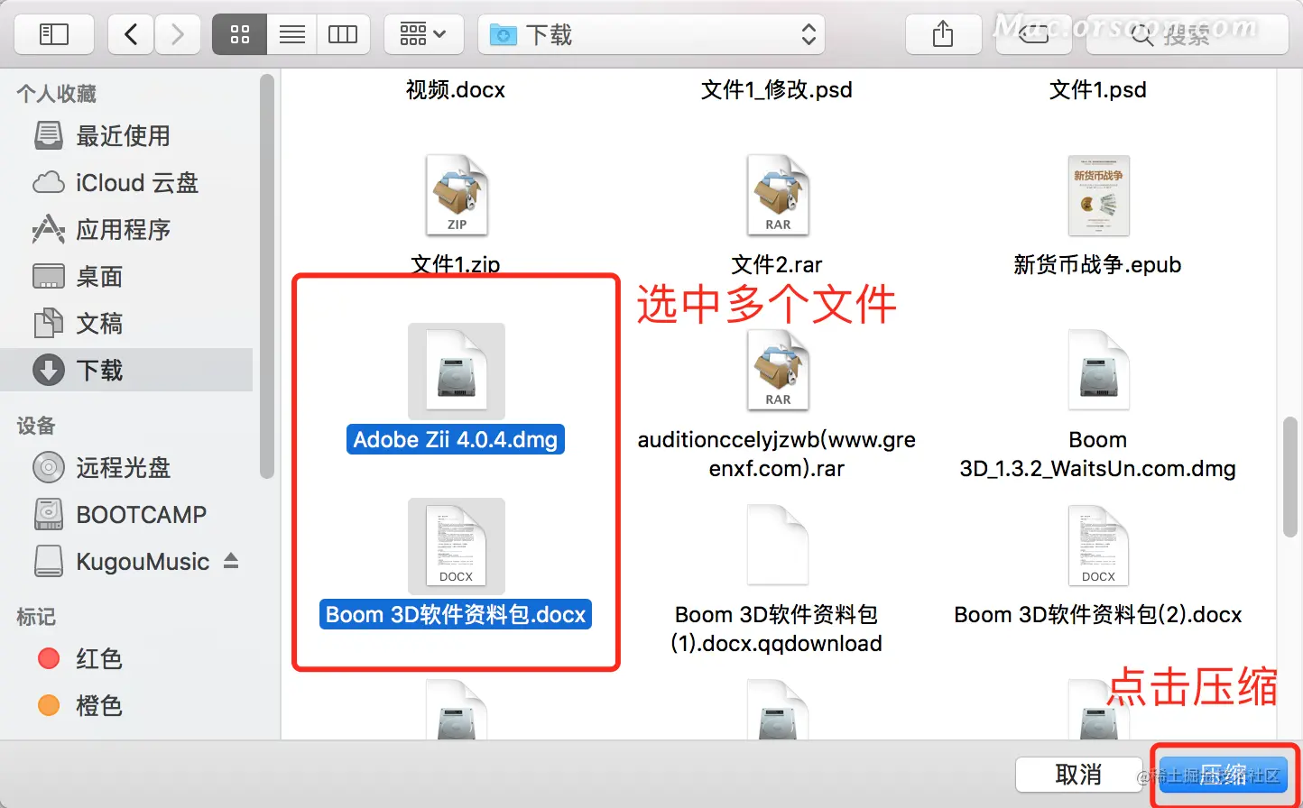 在弹出的窗口中选中多个文件,点击右下角的“压缩”,即可将文件压缩为一个压缩文件。