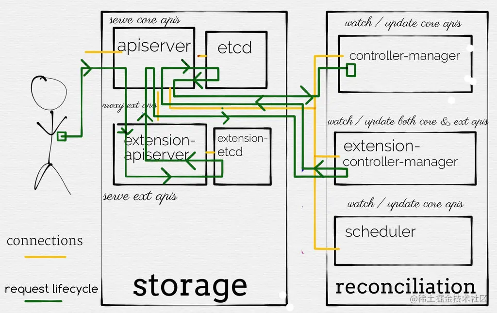 aggregatorServer主要用于处理扩展Kubernetes API Resources的第二种方式Aggregated APIServer(AA),将CR请求代理给AA: