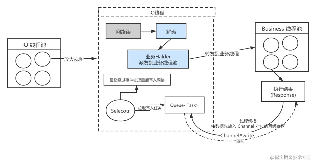- IO 线程在处理完所有就绪事件后,还会从任务队列(Task Queue)获取任务,例如上文中提到的业务线程在执行完业务后需要将返回结果写入网络,Netty 中所有的网络读写操作只能在IO线程中真正获得运行,故业务线程需要将带写入的响应结果封装成 Task,放入到 IO 线程任务队列中。