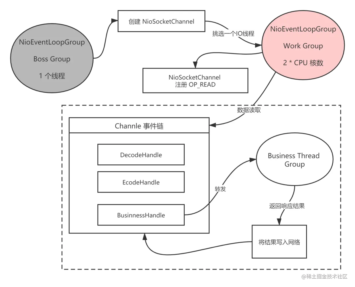 网络的读写操作由 Work Group ( Sub Reactor) 线程组来实现,线程的个数默认为 2 * CPU Core,一个 Channel 绑定到其中一个 Work 线程,一个 Work 线程中可以绑定多个 Channel。