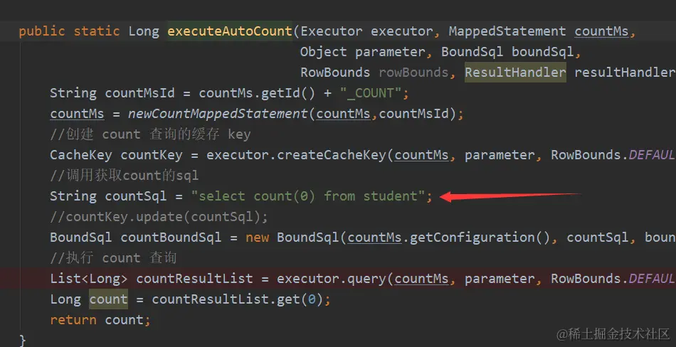 public static Long executeAutoCount(Executor executor, MappedStatement countMs, Object parameter, BoundSql boundSql, RowBounds rowBounds, ResultHandler resultHandler) throws SQLException { //改变MapperStatement中的ID属性 String countMsId = countMs.getId() + "_COUNT"; countMs = newCountMappedStatement(countMs,countMsId); //创建 count 查询的缓存 key CacheKey countKey = executor.createCacheKey(countMs, parameter, RowBounds.DEFAULT, boundSql); //调用获取count的sql String countSql = "select count(0) from student"; //重新封装BoundSql对象 BoundSql countBoundSql = new BoundSql(countMs.getConfiguration(), countSql, boundSql.getParameterMappings(), parameter); //执行 count 查询 List<Long> countResultList = executor.query(countMs, parameter, RowBounds.DEFAULT, resultHandler, countKey, countBoundSql); Long count = countResultList.get(0); return count; } -