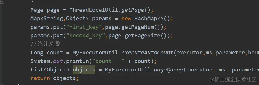 List<Object> objects = MyExecutorUtil.pageQuery(executor, ms, parameter, rowBounds, resultHandler, boundSql, cacheKey, params);