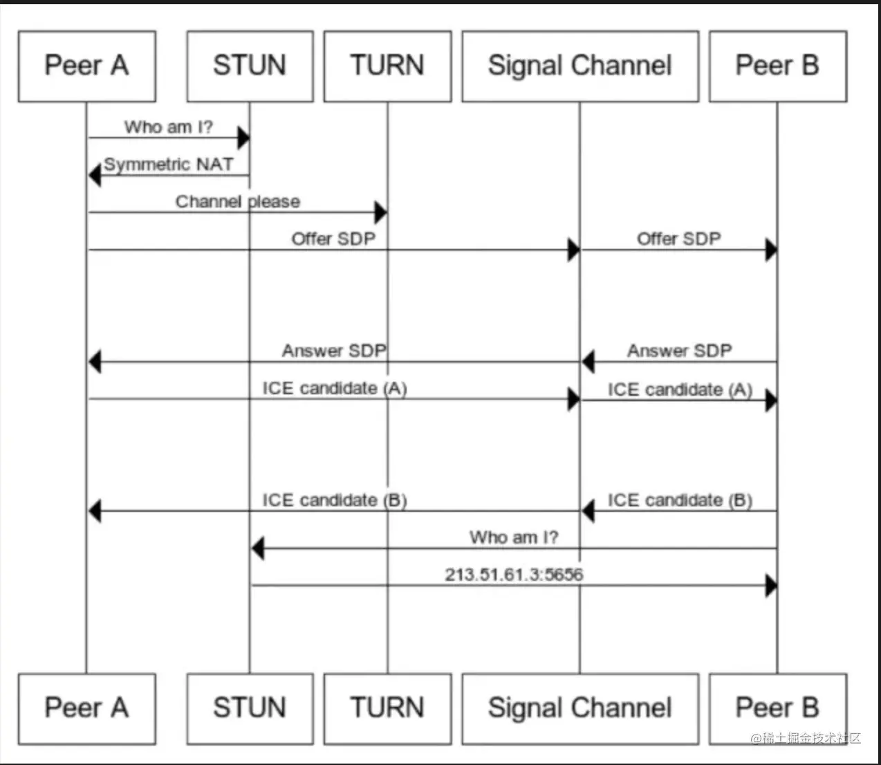 两端需要交换彼此的SDP和ICEcandidate信息,可以通过一个简单的websocket服务器来拿到对方的信令,信令服务器也可以做心跳检查确保对方是在线状态。