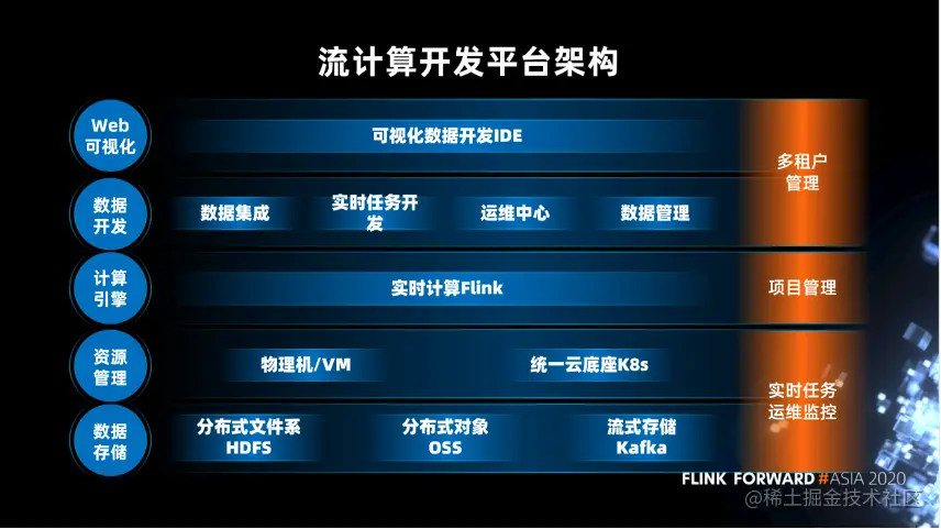 流计算开发平台的架构如下图所示。主要有数据存储、资源管理、计算引擎、数据开发、Web 可视化等。