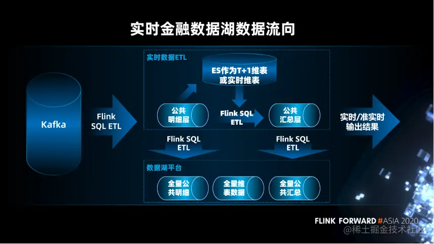 这是实时金融数据湖的数据流向图。实时数据的数据源都来自于 Kafka,然后 Flink SQL 通过 ETL 方式实时读取 Kafka 中的数据。通过实时数据的 ETL 和数据湖平台两种方式对接应用,提供的是实时和准实时的输出结果。其中,实时数据 ETL 对应的是“直通式”实时场景架构,而数据湖平台对应的是“落地式”的实时应用场景架构。