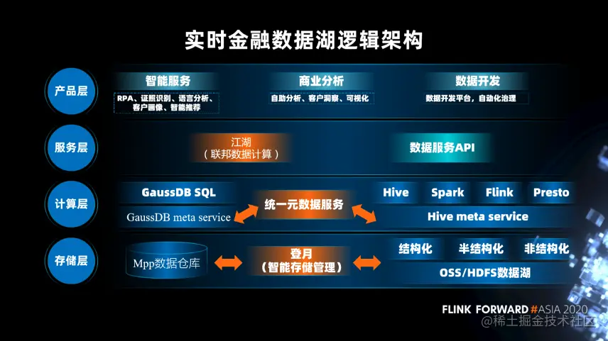 - 第三,融合性。数据湖提供的是一个金融数据湖的架构,支持流批统一的结构化数据的分析处理。当然也支持半结构化和非结构化,因为数据湖用的是分布式存储。