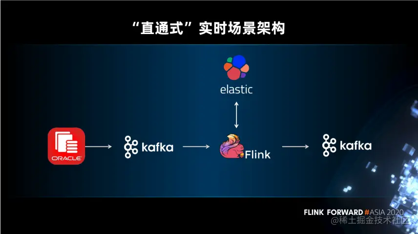 上面主要介绍了流计算开发平台的架构和优势,下面针对具体的场景做进一步介绍。首先是“直通式”实时场景架构。