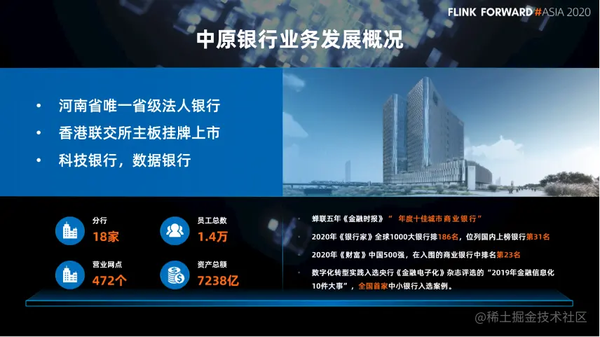 首先简单介绍一下中原银行,它位于河南省郑州市,是河南省唯一的省级法人银行,是河南省最大的城市商业银行。2017 年 7 月 19 日在香港成功上市。中原银行在成立之初就将科技利行和科技兴行作为我行的战略,我行立志要成为一个科技银行和数据银行。我们一直在从事技术,也崇尚技术,希望用技术的手段来解决现在的问题。