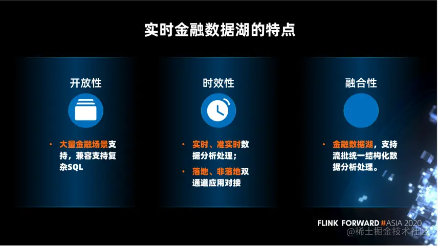 - 第一,开放性。数据湖兼容支持复杂 SQL,支持大量的金融场景。
