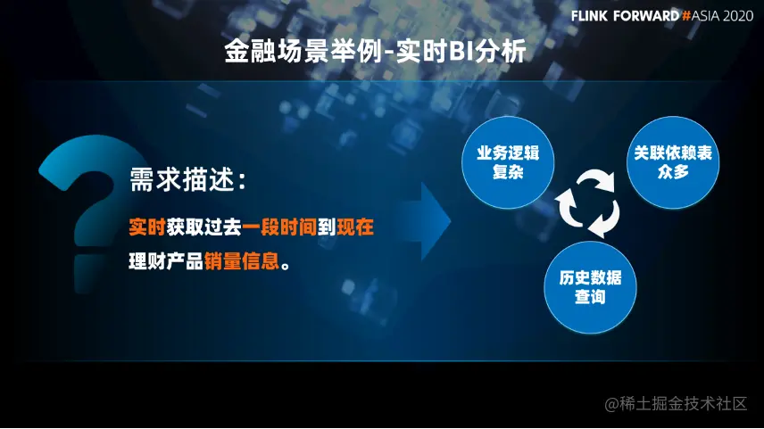 再来看一个例子,实时获取过去一段时间到现在的理财产品销量信息,这个需求有一些关键字,需要“实时获取”,即需要 T+0 的数据。“一段时间到现在”,它涉及历史数据的查询。理财产品的销量信息涉及到银行业务,一般都比较复杂,需要用到多流 join。