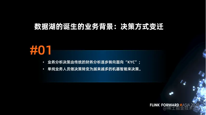 如此多的技术,加上数据驱动决策的场景,决定了当前银行的数据分析面临着一个巨大的变迁,从传统的面向财务的、面向离线的数据分析,逐步转向面向客户的、面向实时的数据分析。以上是实时金融数据湖建设的第一个观点。
