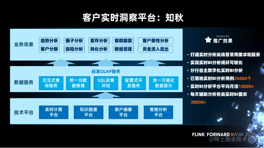 再来看一个实时 BI 场景,主要是客户实时洞察平台,内部叫知秋平台,依赖于实时计算平台、知识图谱平台、客户画像平台、智能分析平台。不同的平台组合在一起,提供了交互式查询服务、统一的元数据管理服务、SQL 质量评估服务、配置式开发服务、统一可视化数据展示等。支持了趋势分析、圈子分析、留存分析、客户客群分析等场景。现在已经可以打通实时分析类场景常用需求和服务,实现实时 BI 分析闭环可视化,分行自主数字化实时 BI 分析,已落地实时 BI 分析用例 26800 个,实时 BI 分析平台平均月活 10000+,每天辅助分析各类实时 BI 需求 30000+。
