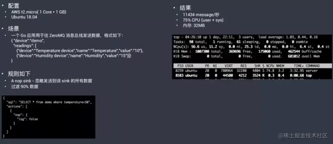 8000规则0.1消息/秒/规则,共计的TPS为800条/秒 规则定义 源:MQTT SQL:select temperature from source where temperature>20(90%数据被过滤) 目标:日志 配置 AWS:2core4GB Ubuntu 资源使用 Memory:89%~72%;0.4MB/rule GPU:25%