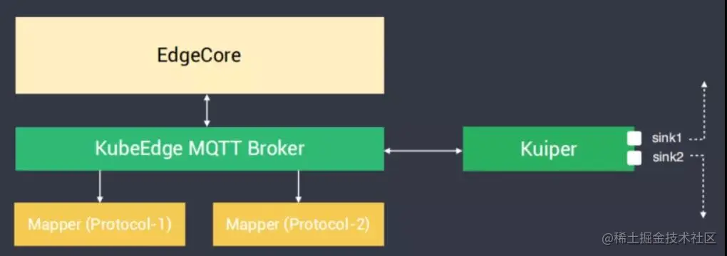 Kuiper是装在 KubeEdge MQTT Broker后面,整个都运行在边缘端,底下为不同的Mapper,也就是接入各种各样不同的协议。边缘MQTT Broker用来交换消息。