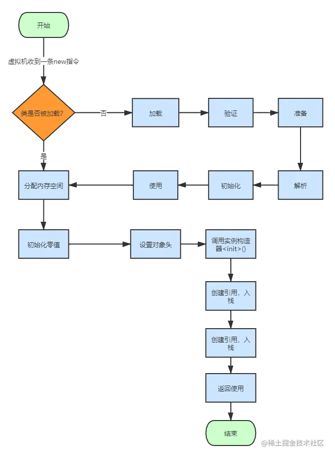 执行到这一步,堆内存中已经存在被完成创建完成的对象,但是我们知道,在Java中使用对象是通过虚拟机栈中的引用来获取对象属性,调用对象的方法,因此这一步将创建对象的引用,并压如虚拟机栈中,最终返回引用供我们使用。