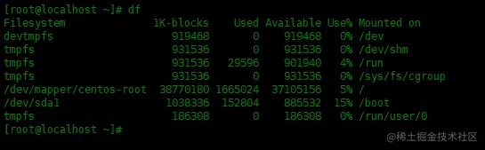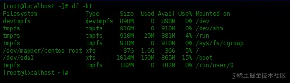 [root@localhost ~]# df -hTFilesystem Type Size Used Avail Use% Mounted ondevtmpfs devtmpfs 898M 0 898M 0% /devtmpfs tmpfs 910M 0 910M 0% /dev/shmtmpfs tmpfs 910M 29M 881M 4% /runtmpfs tmpfs 910M 0 910M 0% /sys/fs/cgroup/dev/mapper/centos-root xfs 37G 1.6G 36G 5% //dev/sda1 xfs 1014M 150M 865M 15% /boottmpfs tmpfs 182M 0 182M 0% /run/user/0