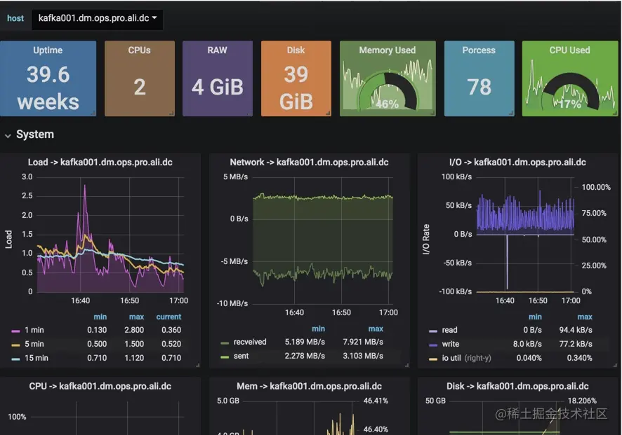 以下是一个grafana主机监控的效果图。由于它的颜值比prometheus自带的高,所以一般都使用grafana。