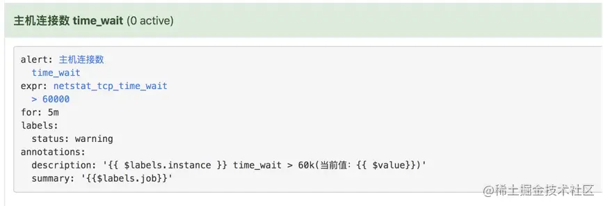 description: "{{ $labels.instance }} time_wait > 60k(当前值:{{ $value}})"