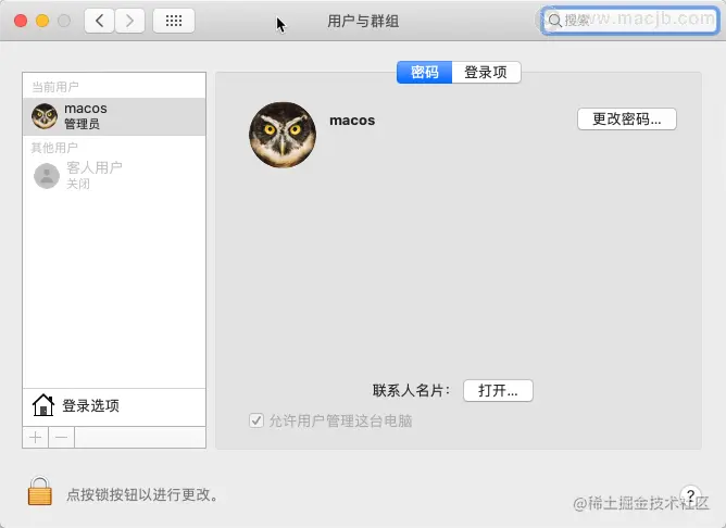 2.进入「系统偏好设置 – 用户与群组」,点按小钥匙,输入密码以解锁。