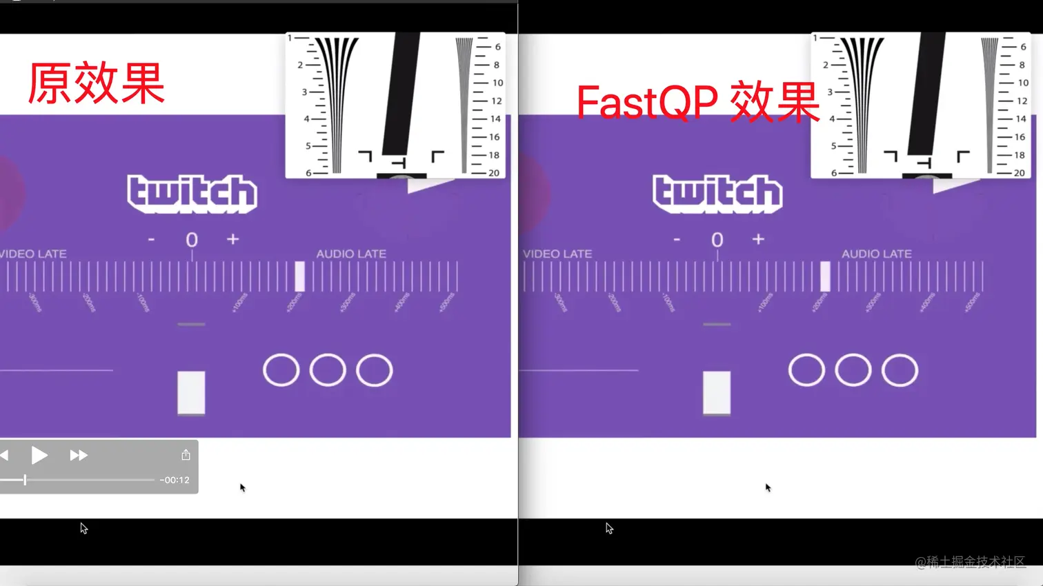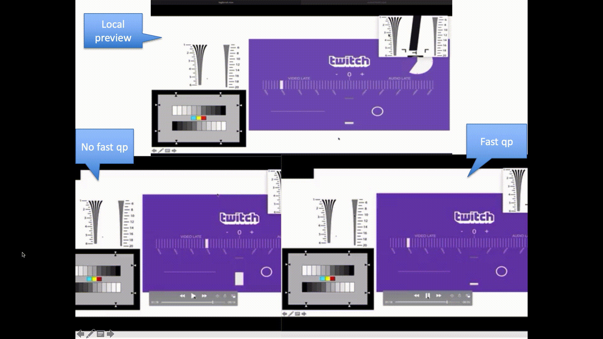 上图中一开始的那个画面(有 Twitch 单词紫色背景)是几乎静止的,只有很小范围的变化,持续了近 10 秒钟,编码器 QP 逐渐下降至很低,然后翻页到一个较复杂纹理的页面(各种分辨率卡条),此时可以看到右下的使用 Fast QP 的画面基本上可以跟得上上方本地预览画面的变化,而左下的没有开 Fast QP 的画面就卡住了,然后又翻了两页,Fast QP 版本均能跟得上变化,而没有开 Fast QP 版本直到最后一页才恢复。