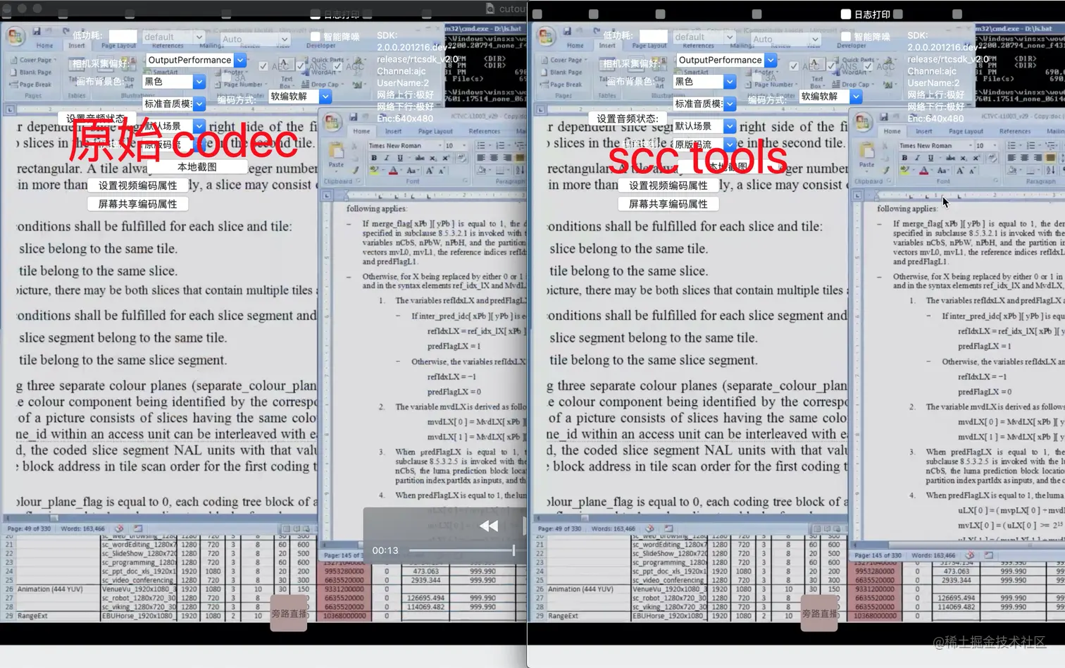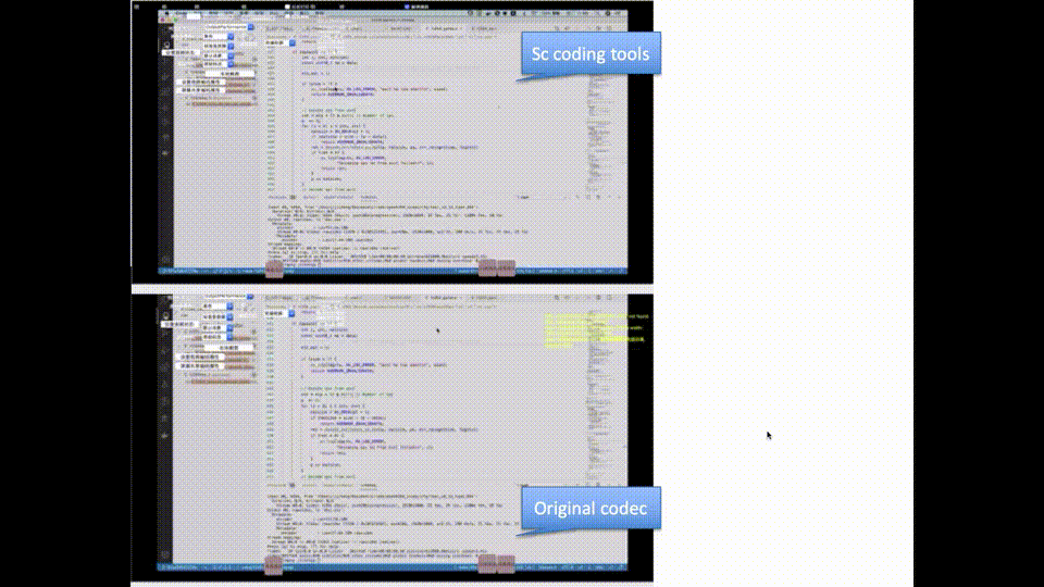 上图中,上半部分是增加了 Screen Content Coding Tools 编码出来的码流,下半部分是原始 Codec 编出的码流,可以看出使用 Screen Content Coding Tools 之后卡顿和延迟明显降低了。
