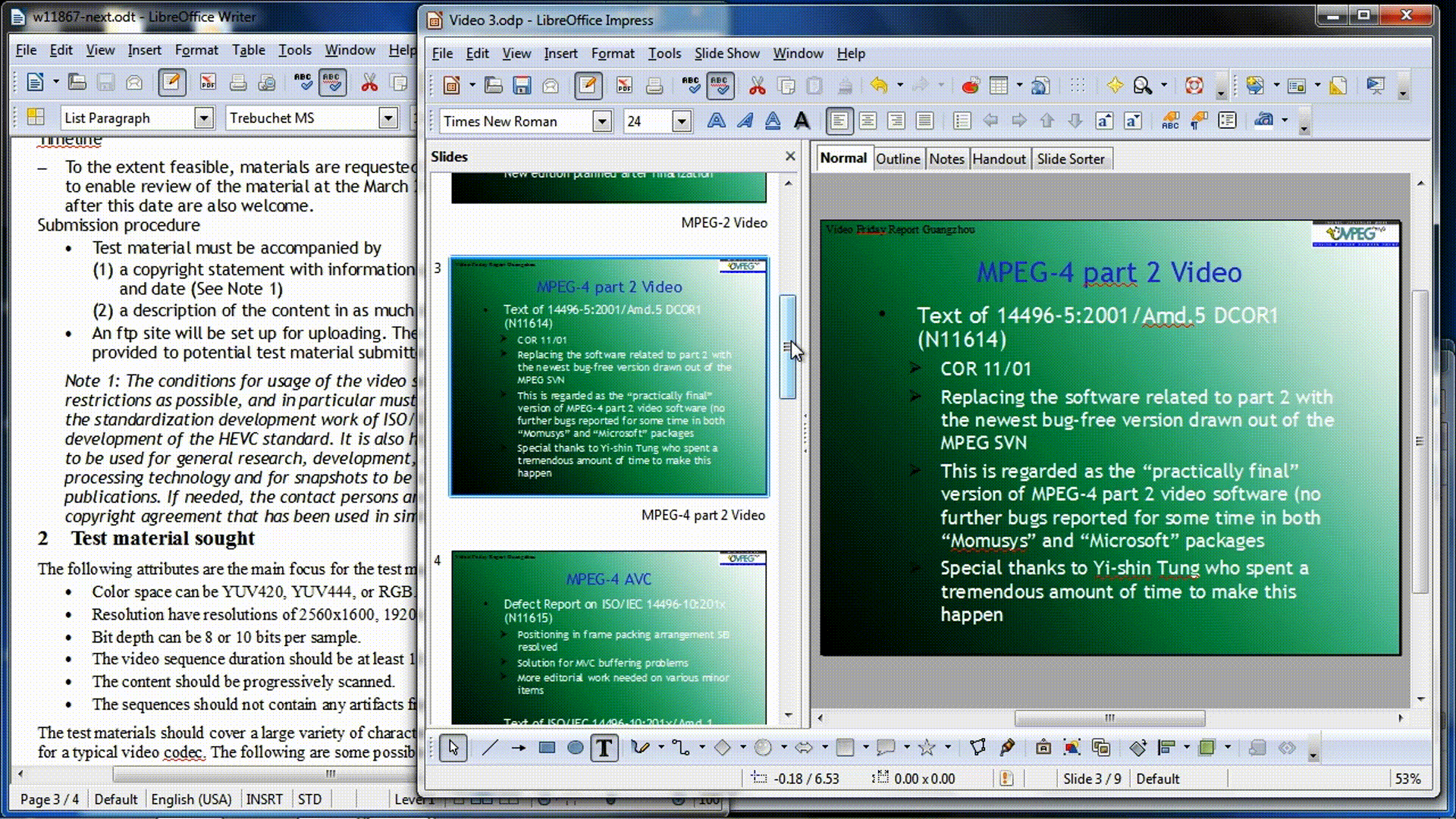 屏幕共享的时候如果是共享桌面文档,PPT 等内容进行演讲,一般翻页速度是相对较慢的,帧率不用很高 5-10 帧每秒即足够;而有时屏幕共享也会播放电影,动画等视频,这样要求的帧率就比较高了,最好能到 20-30 帧每秒才看起来比较舒服。如下面两图,一个是编辑 PPT 的视频,明显帧率可以比较低,另一个是广告视频,明显帧率应该高一些。