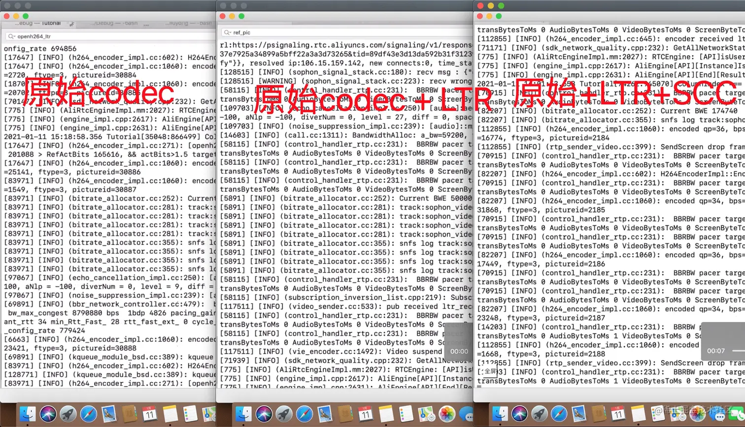 下图中左边是原始 Codec 效果,中间是增加了 LTR 的效果,右边是同时增加了 LTR 和 SCC 的效果,可以看到三者的清晰度并没有明显差别。由于该例子我们共享的是实时的滚屏 Log,所以三者的内容不是完全一样的,但是总体差别不大。