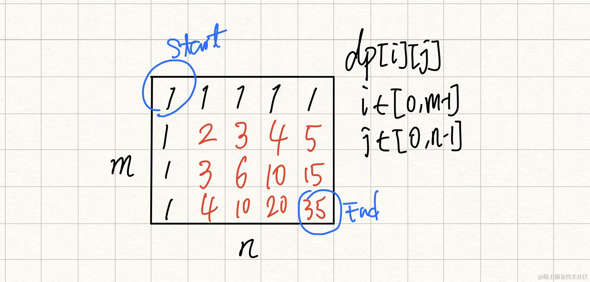 - dp[i][j] 表示从start走到第i行第j列的不同路径数量。