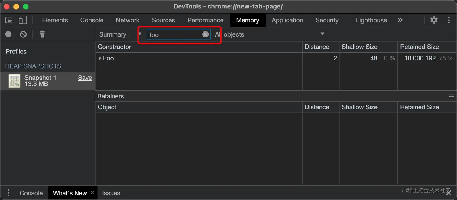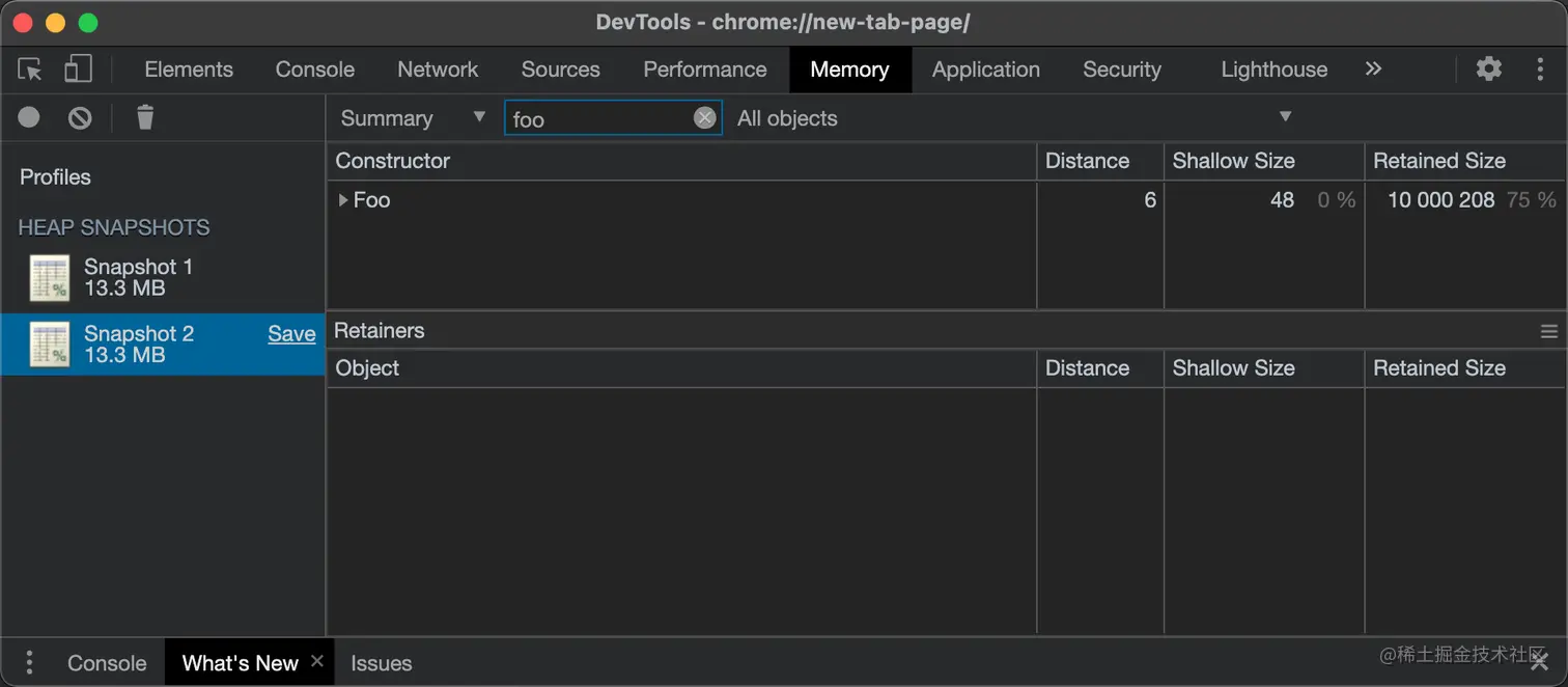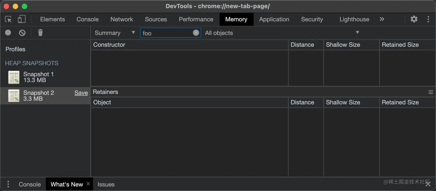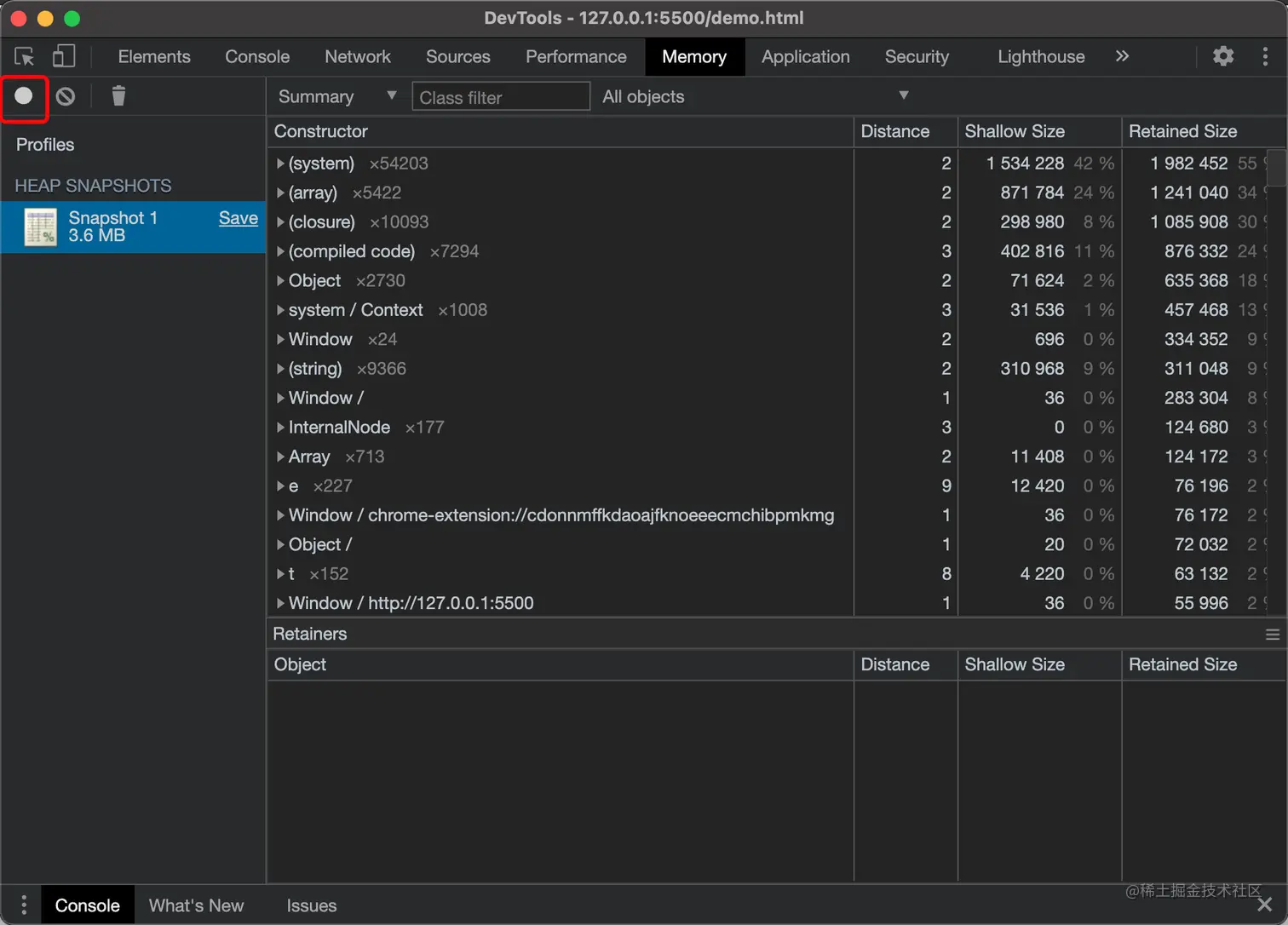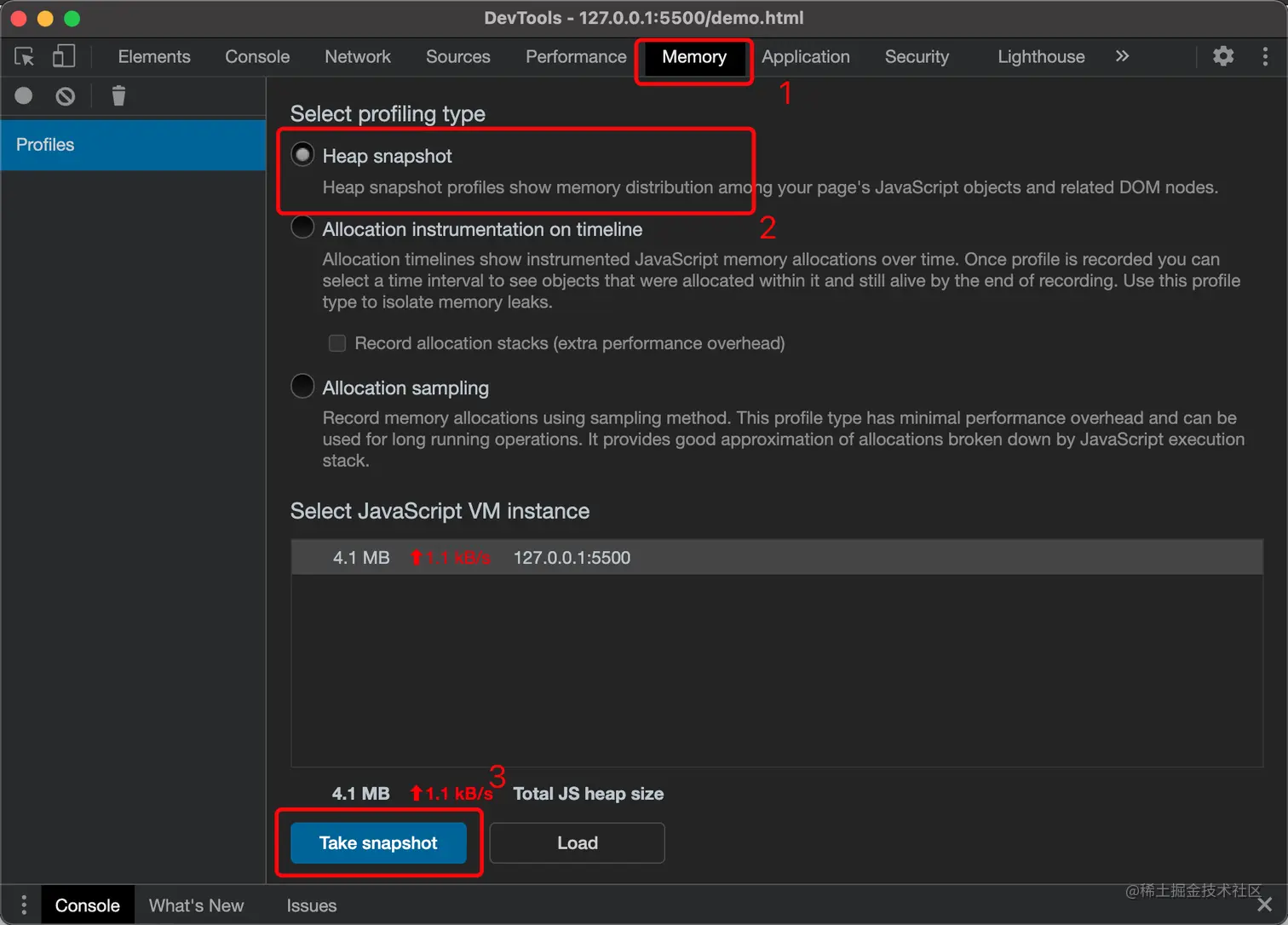 在对比过程中,需要用到 chrome-devtools 的 memory 面板,在此简单介绍一下,更多介绍访问官网。