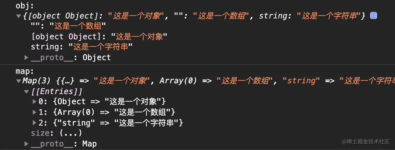 Map 的键可以是任何值,包括函数、对象或任何基本类型。而 Object 的键必须是一个 String 或 Symbol ,如果向其添加了 Object 或 Array 类型,最终也会被转换为 String 。