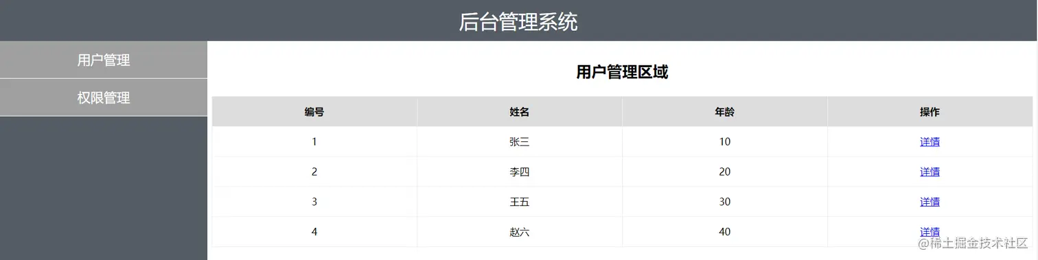 <tr><th>编号</th><th>姓名</th><th>年龄</th><th>操作</th></tr>