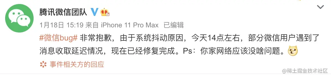 微信团队表示,今天14点左右,部分微信用户遇到了消息收取延迟情况,原因是系统抖动,目前已经修复完成。