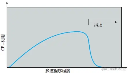 CPU 调度程序看到 CPU 利用率的降低,进而会增加多道程度。新进程试图从其他运行进程中获取帧来启动,从而导致更多的缺页错误和更长的调页设备队列。因此,CPU 利用率进一步下降,并且 CPU 调度程序试图再次增加多道程度。这样就出现了抖动,系统吞吐量陡降,缺页错误率显著增加。结果,有效内存访问时间增加,没有工作可以完成,因为进程总在忙于调页。