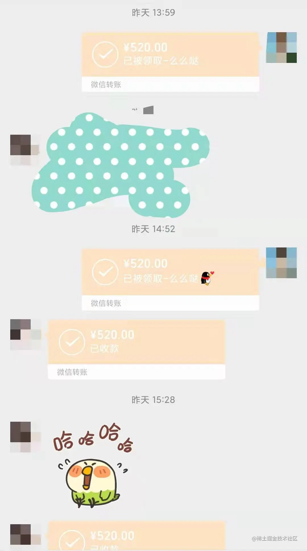 草草收场之后,我们离开了影楼,老婆路上还念叨着红包,看着她可怜兮兮的样子,我心疼啊,于是我又拿起手机转了一个 520 过去,为了区分,我特意在转账留言后面加了一个企鹅发爱心的表情。