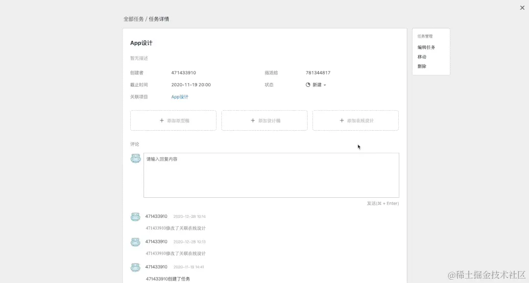 任務的四大信息要素——目標、執行人、期限及交付物,摹客幫你輕松掌控。通過新建任務,即可將任務描述、成員指派、截止時間、項目內容等必要信息快速羅列在任務條目中。更重要的是,使用摹客任務管理,無需對接三方工具。從此告別設計工具與任務管理工具之間的切換。