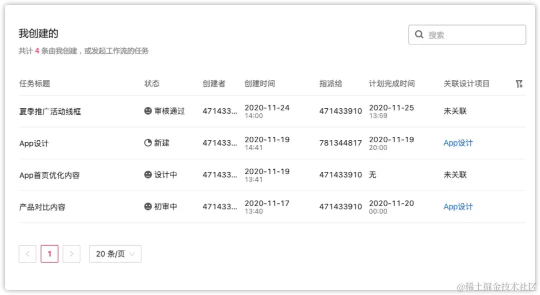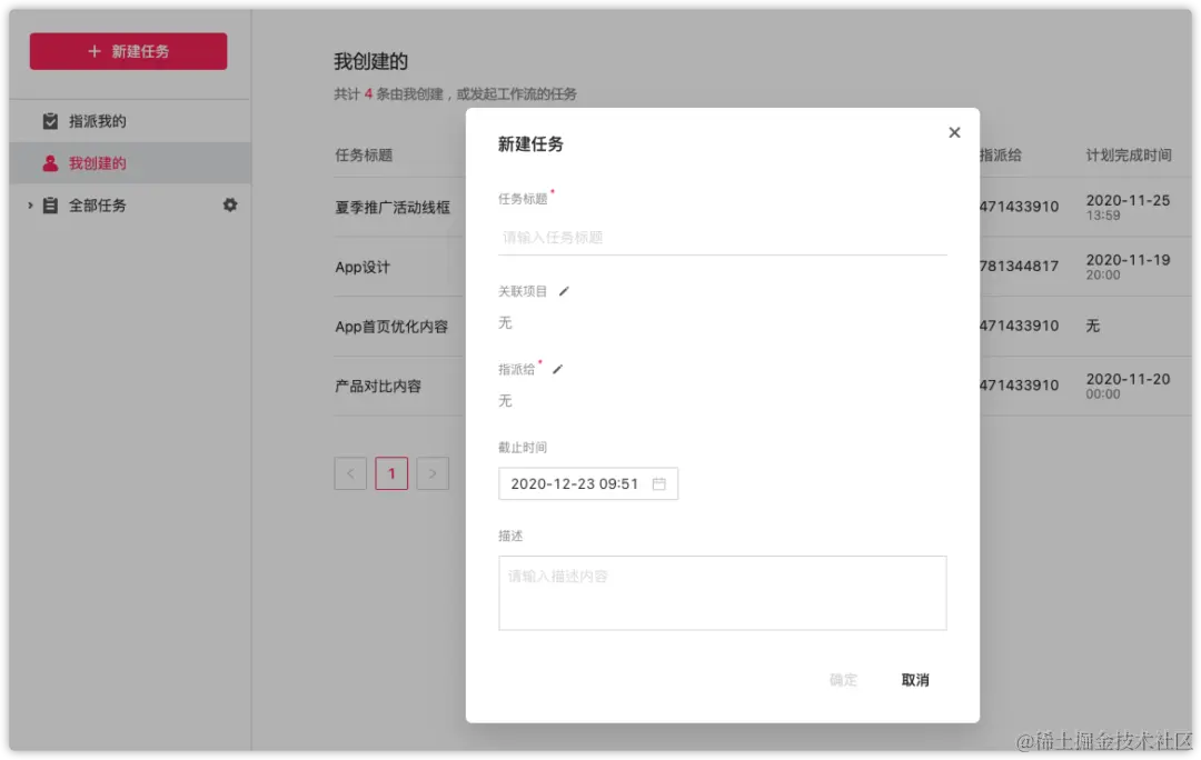在任務管理糢塊中,可以總覽團隊中的任務。支持快速切換“指派給我的任務”或“我創建的任務”,標題、狀態、時間等要素在列表中清晰地展示出來。