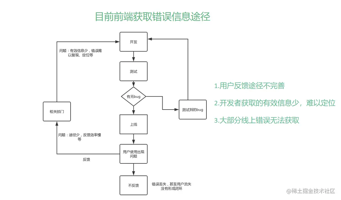 前端代码不像java等后端语言运行在自己的服务器,错误可以直接捕获生成日志,前端代码运行在用户端,发生错误时前端工程师无法知晓。