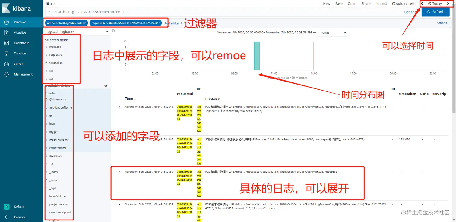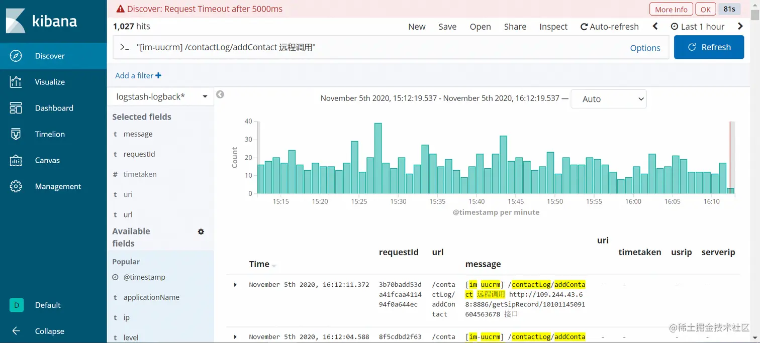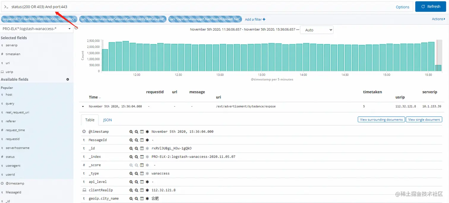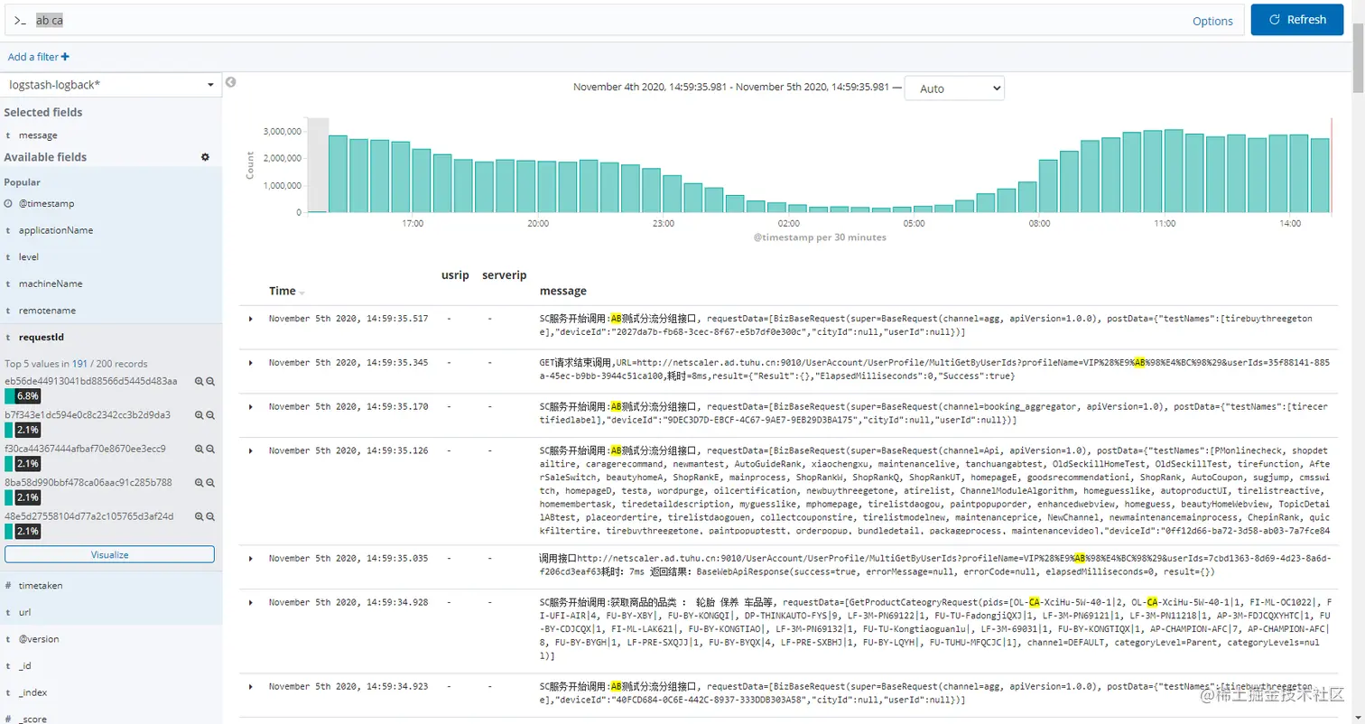 Kibana TongHao 2021-01-20 119 阅读1分钟 页面概况 搜索 直接在搜索栏输入 ab ca, 将会查找出所有message包含 ab、 ca、 ab ca的日志 带有引号的搜索,将被识别为一个句子 按照键值对进行查询 逻辑运算可以同时作用在单个关键字内,也可以作用于多个关键字之间