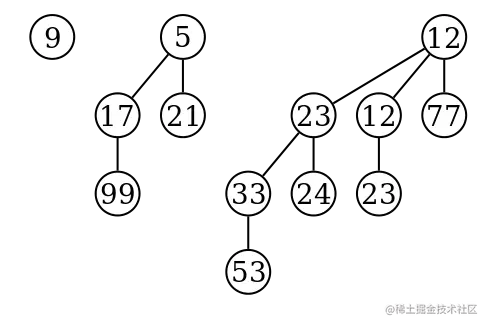 二项堆的二项树结构由结点数的二进制表示唯一确定,因此结点数为的二项堆最多只有棵二项树。例如,13的结点数为,即具有度数为3、2、0的三棵二项树,如下图: