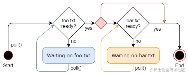 上面这张图用箭头表示状态切换,用菱形表示分支路径。例如,如果foo.txt没有准备好,就会选择标记"no"的路径然后进入”Waiting on foo.txt“状态。否则,就会选择"yes"路径。中间较小的没有标题的红色菱形表示example函数的if content.len() < 100分支。